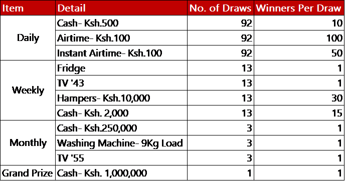 · Note: Only codes sent from local network providers- Safaricom and Airtel will be able to enter the promotion